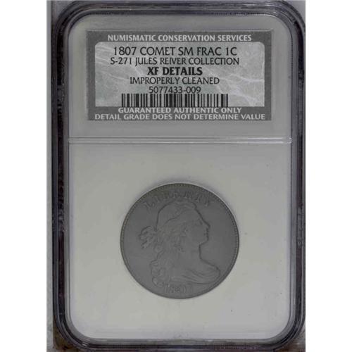 <B>1807<1C> "Comet" Variety. S-271, B-1, R.1--Improperly Cleaned--NCS. XF Details. VF20 EAC.</B></I> Die State IV. Apparently from an early stage within this die state, but the "comet" feature is bold, and faint parallel straight lines extend into the fields from the right obverse rim at the mouth and neck, and behind the lower curls. There are heavy clash marks before and behind the head. This lovely example is well struck, well centered, and boldly detailed on a pleasing olive-brown planchet. The only mentionable mark, and not overly distracting, is a light, straight scratch that extends from the rear of the hair ribbon to the left rim. An attractive and highly collectible example of this popular variety.<BR><I>Ex: Edward Schwartz (Abe Kosoff, 10/1961), lot 338; George Ramont.</B></I> Envelope Included.