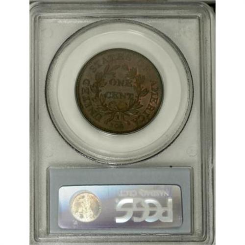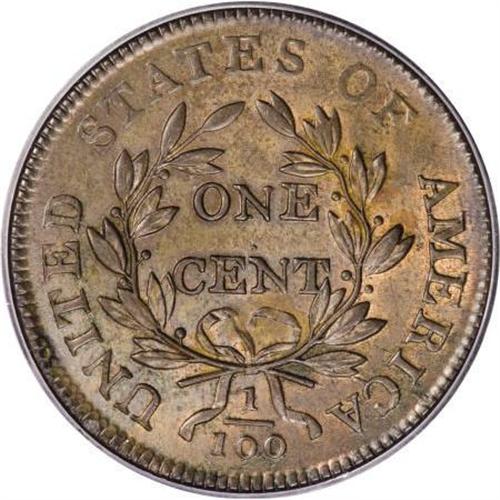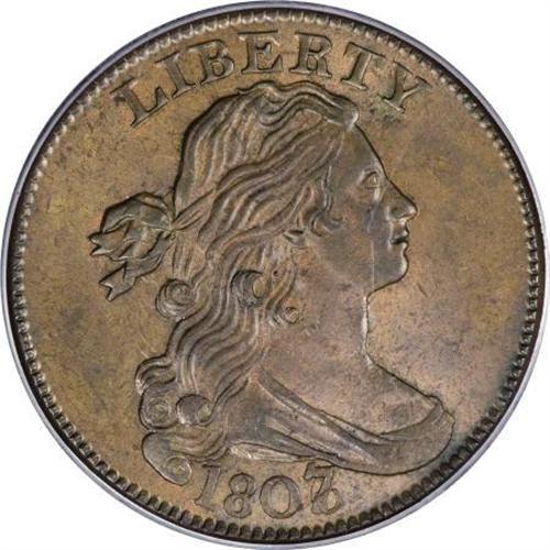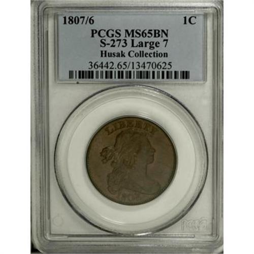 <B>1807 1C Large 7 over 6. MS65 Brown PCGS. S-273, B-3, R.1.</B></I> <B>Bland MS62; CC-2. Noyes MS60; tied for CC-4. Photo #23154. Our EAC Grade MS60+.<BR><BR>Equivalents. </B></I>Proskey 1; Doughty 203; McGirk 1A; Clapp 3; EAC 3; <I>Encyclopedia </B></I>1768; PCGS #1528.<BR><B><BR>Variety. </B></I>Overdate, large 7. Leaf point below upright of D. The obverse appears on S-273. The reverse appears on S-271, S-272, and S-273.<BR><B><BR>Surfaces.</B></I> Gorgeous tan and olive surfaces with considerable faded mint red on the obverse, and splashes of bright orange luster on the reverse. The surfaces are flawless, save for a few tiny planchet flakes on the obverse. Both sides are nicely defined, although the drapery is blunt, and a few leaves lack detail. The raised die lump right of the date is clearly visible.<BR><B><BR>Die State II. </B></I>Light clash marks are evident on each side, with minor die flaws.<BR><B><BR>Appearances. </B></I>The obverse and reverse are illustrated in Walter Breen's <I>Encyclopedia of United States Large Cents</B></I>.<BR><BR><B>Census. </B></I>A single amazing Gem is followed by this example and a few other Mint State pieces in Bland's Census, although it is ranked lower in Noyes' Census.<BR><BR><B>Commentary. </B></I>The two overdate varieties for the year cover both ends of the rarity spectrum. The Small Overdate (S-272) is one of the rarest Draped Bust cent varieties, especially in the 1800s, while the Large Overdate (S-273) is one of the commonest.<BR><BR><B>Provenance. </B></I><I>Barney Bluestone; Dr. Jasper Robertson; French's (3/1967), lot 575, $1,400; C. Douglas Smith; Dr. Robert A. Schuman; Superior (9/2004), lot 601, $37,375.</B></I><BR><BR><b>Shipping:</b> Coins & Currency (<a target="_blank" href="http://www.heritageauctions.com/common/shipping.php">view shipping information</a>)