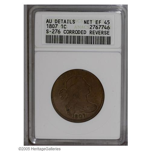 <B>1807<1C> Large Fraction--Corroded Reverse--ANACS. AU Details, Net XF45.</B></I> S-276, R.1. Rich red-brown coloration is spread evenly over the two sides. AU details remain evident, as the unabraded surfaces reveal minor wear and scattered light corrosion, mainly on the reverse, as noted by ANACS. The most common variety of this year.