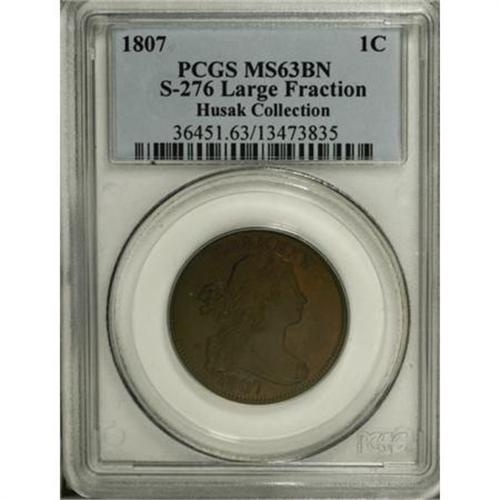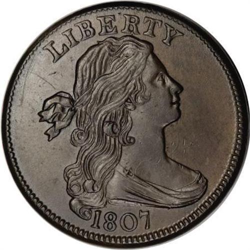 <B>1807 1C Large Fraction. MS63 Brown PCGS. S-276, B-6, R.1. </B></I> <B>Noyes XF40; tied for CC-12. Photo #36285. Our EAC Grade XF45.<BR><BR>Equivalents. </B></I>Proskey 5; Doughty 207; McGirk 5D; Clapp 6; EAC 6; <I>Encyclopedia </B></I>1772; PCGS #1516.<BR><B><BR>Variety. </B></I>Blunt 1 close to curl. ER nearly touches hair. Large Fraction. The obverse appears on S-276. The reverse appears on S-275 and S-276.<BR><B><BR>Surfaces.</B></I> Sharply detailed, except for some leaves in the left branch, with pleasing golden-brown and darker steel enhanced by traces of iridescence on each side. A small scrape is visible on the upper edge of the drapery below the hanging curl. The reverse is rotated 90 degrees counterclockwise.<BR><B><BR>Die State I. </B></I>The earliest die state, with faint clash marks on each side.<BR><B><BR>Census. </B></I>Unlisted by Bland, this example ranks in the top dozen on the Noyes listing. He only records 10 examples that grade AU or better.<BR><B><BR>Provenance. </B></I><I>Stuart Levine (1996); Denis W. Loring; Robert C. Clark; Bowers and Merena (8/2000), lot 324, $1,955; Chris Victor-McCawley (10/2000).</B></I><BR><B><BR>Personality. Stuart Levine</B></I> was born March 23, 1957, in Schenectady, New York, and raised in Massachusetts, attending Brandeis University. He took leave from school in 1979 to marry (Maureen) and become a professional numismatist. He remains in the business today, operating out of Marblehead, Massachusetts. Levine specializes in Colonial-era coins and currency, U.S. Mint patterns, early U.S. coinage, and Territorial gold. He is also an advanced collector of Continental dollars, Continental currency, and Massachusetts currency engraved and printed by Paul Revere. He worked closely with New Jersey collector Ed Price, forming the finest cabinet of early U.S. dimes ever assembled by date and variety. Levine is currently assisting Eric Newman in an updated edition of <I>The Early Paper Money of America</B></I>.<BR><BR>The fourth director of the U.S. Mint, <B>Robert Patterson</B></I> served from his appointment by Thomas Jefferson on January 17, 1806 and was the first director to die in office, on July 22, 1824. A native of Ireland who was born on May 30, 1743, Patterson proved an excellent and able officer of the Mint. He came to America in 1768 at the age of 25 and served as a schoolmaster in Pennsylvania and later as a mathematics professor at the University of Pennsylvania, continuing that position until 1814, even while serving as Mint director. In his appointment, Jefferson advised that he should not give up his other employment. His son-in-law, Samuel Moore, served as the fifth director of the Mint, his son, Robert Maskell Patterson, served as sixth Mint director, and another son-in-law, William Ewing DuBois, was an assayer for 48 years.<BR><BR><b>Shipping:</b> Coins & Currency (<a target="_blank" href="http://www.heritageauctions.com/common/shipping.php">view shipping information</a>)