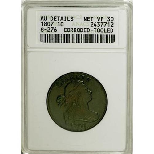 <B>1807 1C Large Fraction--Corroded, Tooled--ANACS. AU Details, Net VF30.</B></I> S-276. NGC Census: (2/13). PCGS Population (3/23). Mintage: 829,221. Numismedia Wsl. Price for NGC/PCGS coin in VF30: $425. (#1516)<BR><BR><B>Coin Engraver:</B> Robert Scot<BR><BR><b>Shipping:</b> Coins & Currency (<a target="_blank" href="http://www.heritageauctions.com/common/shipping.php">view shipping information</a>)