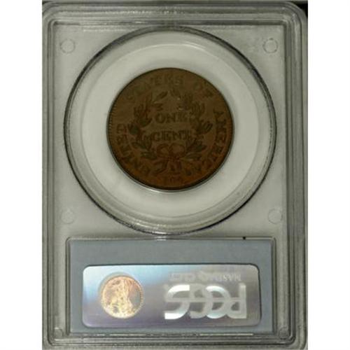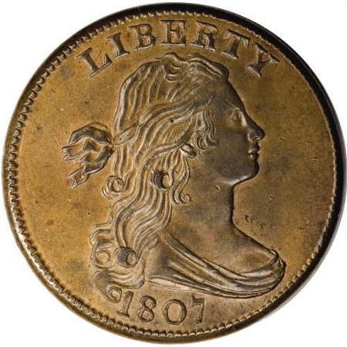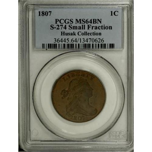 <B>1807 1C Small Fraction. MS64 Brown PCGS. S-274, B-4, R.2.</B></I> <B>Bland AU50; CC-1. Noyes AU50; CC-1. Photo #21173. Our EAC Grade AU50.<BR><BR>Equivalents. </B></I>Proskey 2; Doughty 204; McGirk 3A; Clapp 4; EAC 4; <I>Encyclopedia </B></I>1771; PCGS #1534.<BR><B><BR>Variety. </B></I>Blunt 1 close to curl. ER high above hair. Fraction bar extends right. The obverse appears on S-274 and S-275. The reverse appears on S-274.<BR><B><BR>Surfaces.</B></I> Rich chestnut surfaces with olive and steel toning, and splashes of maroon on the reverse. The glossy surfaces on both sides have a few small ticks that identify it as the Breen plate coin.<BR><B><BR>Die State III. </B></I>An intermediate die state with a few minor bulges, cracks, and clash marks.<BR><B><BR>Appearances. </B></I>The obverse and reverse are illustrated in Noyes (1991) and Walter Breen's <I>Encyclopedia of United States Large Cents</B></I>.<BR><BR><B>Census. </B></I>The Husak AU50 stands above all others as the finest known example of the S-274 marriage.<BR><BR><B>Commentary. </B></I>This is the finest example of the variety, known since about 1900, yet it has never been offered for sale in a public auction. The present auction may literally prove to be a once-in-a-lifetime opportunity.<BR><BR><B>Provenance. </B></I><I>Hollis Page; Dr. Thomas Hall (9/1909); Virgil M. Brand; New Netherlands (privately, 1951); C. Douglas Smith (8/1958); Dr. William H. Sheldon (4/1972); R.E. Naftzger, Jr. (2/1992); Eric Streiner (3/1992); C. Douglas Smith; Chris Victor-McCawley (7/2005).</B></I><BR><BR><B>Personality. C. Douglas Smith</B></I> was born on June 17, 1914, and died on September 20, 1999. He was employed in the railroad business until his retirement in 1981. An avid large cent collector, Smith formed several collections over many years. He is remembered for his belief that a collector can appreciate a coin only after he had owned it three times. He provided cataloging assistance to Stack's for several important sales from the 1950s through the 1980s, including the Floyd Starr Collection in 1984. Smith discovered the 1794 NC-4 and 1801 NC-3 varieties.<BR><BR><b>Shipping:</b> Coins & Currency (<a target="_blank" href="http://www.heritageauctions.com/common/shipping.php">view shipping information</a>)