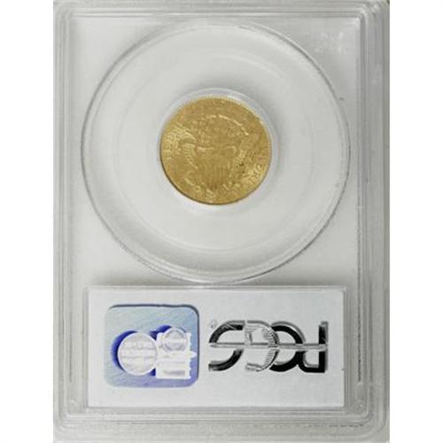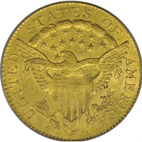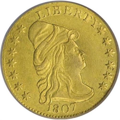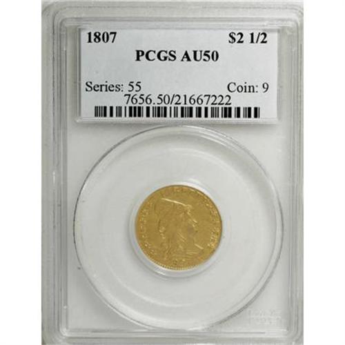 <B>1807 $2 1/2 AU50 PCGS.</B></I> Breen-6124, BD-1, R.3. The only known die marriage of this early date, and the final issue of the Capped Bust to Right type of quarter eagle. This issue had a low mintage (by modern standards) of 6,812 pieces. However, this modest number of coins was more than double the next-lowest mintage total for the Capped Bust to Right series. This AU example displays smooth fields and well centered, generally bold devices. The final reverse star and the eagle's shield are noticeably weak, and a few of the obverse star centrils are incomplete. Shallow indentations located near the obverse periphery at 2 and 5 o'clock, respectively, appear to be mint-made. Both sides exhibit a pleasing, even greenish-gold cast. This relatively high grade example should generate considerable interest when it crosses the auction block. <BR><BR><B>Coin Engraver:</B> Robert Scot<BR><BR><b>Shipping:</b> Coins & Currency (<a target="_blank" href="http://www.heritageauctions.com/common/shipping.php">view shipping information</a>)