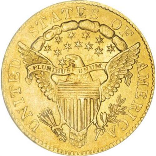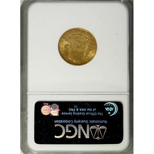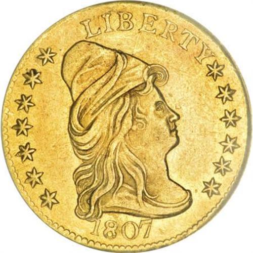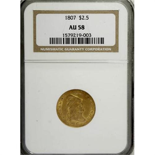 <B>1807 $2 1/2 AU58 NGC.</B></I> Breen-6124, BD-1, R.3, the only dies. 1807 half cents and dimes were also struck from just one die pair each. The 1807 quarter eagle and dime share the same hardy reverse die, which also struck all 1805 and 1806-dated quarter eagles. The present Borderline Uncirculated representative exhibits essentially full mint luster on the reverse, and luster also fills the obverse margin and Liberty's hair and cap. The upper right obverse field has a few abrasions, and a hair-thin mark reaches the T in UNITED, but the surfaces are generally smooth. Adjustment marks are minor, and limited to the upper half of the shield. Census: 31 in 58, 57 finer (11/07).<BR><BR><B>Coin Engraver:</B> Robert Scot<BR><BR><b>Shipping:</b> Coins & Currency (<a target="_blank" href="http://www.heritageauctions.com/common/shipping.php">view shipping information</a>)