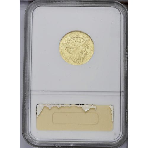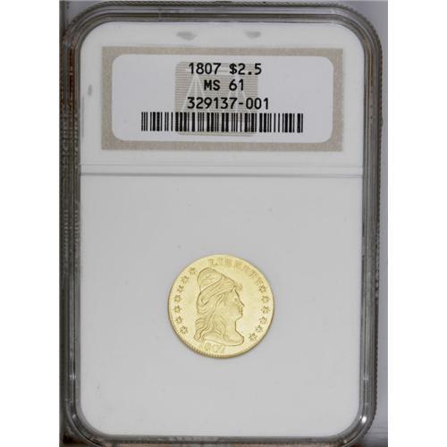<B>1807<$2 1/2> MS61 NGC.</B></I> Bass-3016, Breen-6124, R.3. Pale gold and notably lustrous, showing just a hint of reflectivity. As usually found on this date, the strike is weak in the centers, with incompleteness notable on the hair above Liberty's ear, through the upper half of the shield and in the center of the banner. The mintage of 6,812 pieces, although low, is the highest total of any quarter eagle before the Classic Head design began in 1834, and more than twice the nearest competitor of the Capped Bust to Right design. However, although this date is common in relation to the type and therefore often used for type collection purposes, it is still quite rare in absolute terms and particularly so in Mint State grades. This coin will be a prize of the winning bidder's collection.<BR><I>From The Manistee Collection.</B></I>