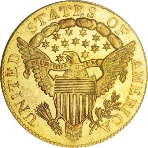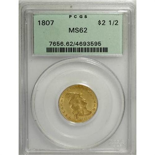 <B>1807 $2 1/2 MS62 PCGS.</B></I> BD-1, R.3, the only known variety. The 1807 quarter eagle is the last year of Robert Scott's Heraldic Eagle design type, coined 1796 to 1807. Walter Breen, in his 1988 <I>Complete Encyclopedia of U.S. and Colonial Coins</B></I>, writes:<BR><BR>"During this whole decade, quarter eagles were coined only in isolated driblets of a few hundred or at most a few thousand pieces. The problem is less why the coins are rare, why so few were made to begin with, but why any were struck at all! To judge from available Archives records, they were ordered on whim by a few local banks (principally the Bank of Pennsylvania and the Bank of the United States); to judge from the condition of survivors, they spent most of their time in vaults."<BR><BR> The 1807 is generally considered the most available quarter eagle of its type in all grades. In and around Mint State, it is a favorite among type collectors owing to its relative availability. However, this should not be taken to mean that it is "common;" indeed, locating a pleasing, problem-free example can be challenging.<BR> This MS62 coin displays flashy semi-prooflike fields that yield noticeable contrast with the mildly frosted motifs. A well executed strike leaves strong definition on the design features, further accentuating the field-device contrast, and pretty yellow-gold color on each side gives off a greenish cast. A few handling marks are scattered about, none of which is worthy of individual mention. This lovely piece, housed in a green-label holder, is ever so close to the Select level of preservation.<BR><BR><B>Coin Engraver:</B> Robert Scot<BR><BR><b>Shipping:</b> Coins & Currency (<a target="_blank" href="http://www.heritageauctions.com/common/shipping.php">view shipping information</a>)