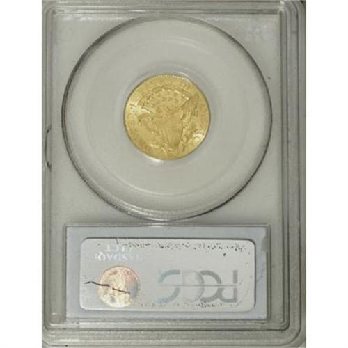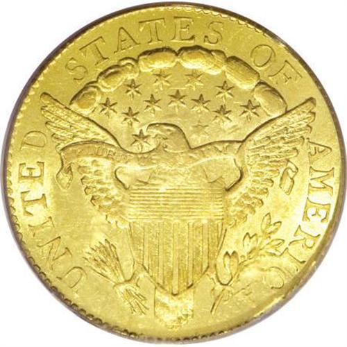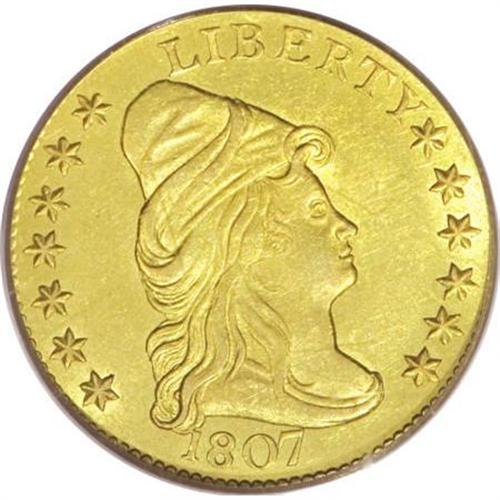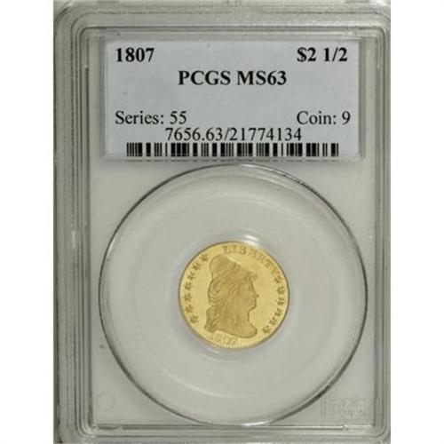 <B>1807 $2 1/2 MS63 PCGS.</B></I> Breen-6124, BD-1, R.3. The Mint production of 6,812 quarter eagles in 1807 represents half of the total quarter eagle coinage for all earlier years from 1796 to 1806. Type collectors often choose this date due to a perception that it is common. An estimated survival of 250 to 350 coins reveals its rarity. The 1807 is only common in relation to other early dates of the denomination. Actual mintage figures for coins bearing any date is established by educated guess, since dies were used until they wore out or broke apart. Many quarter eagles coined in 1807 may have been dated 1805 or 1806, and not impossibly even 1804.<BR> Quarter eagles are unique among early federal gold as several varieties shared reverse dies used for dimes. Diameters of the two denominations were nearly identical and the reverse dies did not carry a denomination. The reverse die of this coin was used for several issues, including four quarter eagle varieties from 1805 to 1807, and the 1807 dime. The die was nearly worn out when it was retired at the end of the 1807 dime coinage.<BR> The first half eagles and eagles emerged from the coining department of the Mint during the summer of 1795; quarter eagles followed in September 1796. Mintage figures for this denomination remained small due to its unpopularity. The larger denominations were preferred by individuals and institutions making gold deposits. All coins produced from gold and silver received by the Mint were paid out to depositors in the order received. Quarter eagles were merely a means to balance the accounts as most depositors requested larger gold pieces.<BR> Pleasing surfaces display light green-gold color with satiny obverse luster and frosty reverse luster. The usual grade-limiting imperfections are visible on both sides, but with little actual significance. Both sides are sharp from perfect dies with slight weakness at the centers. Faint adjustment marks are only seen on clouds 5 through 7. Population: 5 in 63, 3 finer (7/07).<BR><BR><B>Coin Engraver:</B> Robert Scot<BR><BR><b>Shipping:</b> Coins & Currency (<a target="_blank" href="http://www.heritageauctions.com/common/shipping.php">view shipping information</a>\)