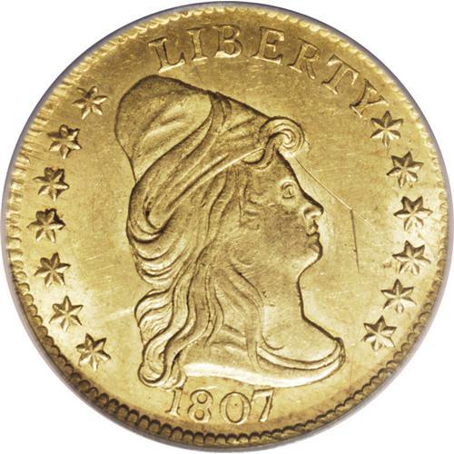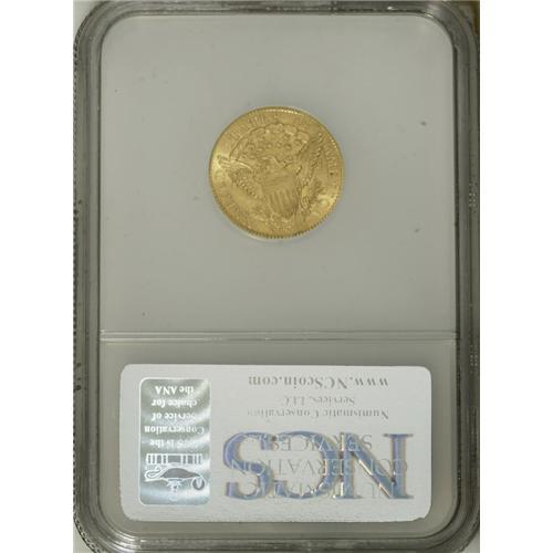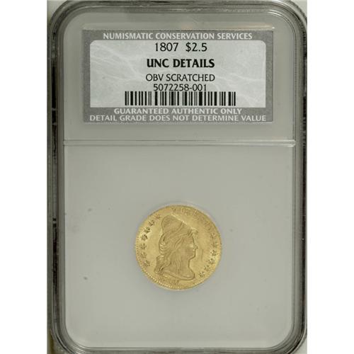<B>1807 $2 1/2 --Obverse Scratched--NCS. Unc Details.</B></I> Breen-6124, BD-1, R.3. The 1807 quarter eagle has the highest mintage of any issue from the early series that was struck between 1796 and 1834, yet only 6,812 pieces were coined. Faint scratches in the right obverse field, mentioned by NCS, are the only imperfections on either side of this otherwise pleasing piece. Both sides have fully lustrous and frosty green-gold surfaces with no trace of wear. The strike is sharp and nicely centered with complete obverse and reverse borders, an unusual feature on these coins. The reverse is an early die state, struck before the majority of 1807 dimes that shared this die.<BR><BR><b>Shipping:</b> Coins & Currency (<a target="_blank" href="http://www.heritageauctions.com/common/shipping.php">view shipping information</a>)