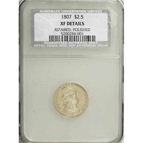 <B>1807 $2 1/2 --Repaired, Polished--NCS. XF Details.</B></I> Breen-6124, BD-1, R.3. The only dies for this final Bust Right date. The obverse field is unnaturally recessed and exhibits myriad fine tooling marks. Both sides are glossy from polishing, and the obverse rim has a small ding at 12 o'clock. Nonetheless, an affordable example of a desirable early gold type.<BR><I>From The John Stimson, Sr. Collection, Part One.</B></I><BR><BR><B>Coin Engraver:</B> Robert Scot<BR><BR><b>Shipping:</b> Coins & Currency (<a target="_blank" href="http://www.heritageauctions.com/common/shipping.php">view shipping information</a>)