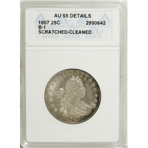 <B>1807 25C --Scratched, Cleaned--ANACS. AU55 Details.</B></I> B-1, R.3. The first S in STATES is centered roughly between the first and second clouds. This partly retoned piece has a crescent of blue-violet at the lower right obverse. Softly struck but with little actual wear. The silver-gray surfaces have an unnatural radiance, and a scratch runs from the eagle's left (facing) wing across the field of stars to 1 o'clock on the reverse rim.<BR><BR><B>Coin Engraver:</B> Robert Scot<BR><BR><b>Shipping:</b> Coins & Currency (<a target="_blank" href="http://www.heritageauctions.com/common/shipping.php">view shipping information</a>\)