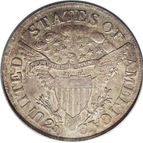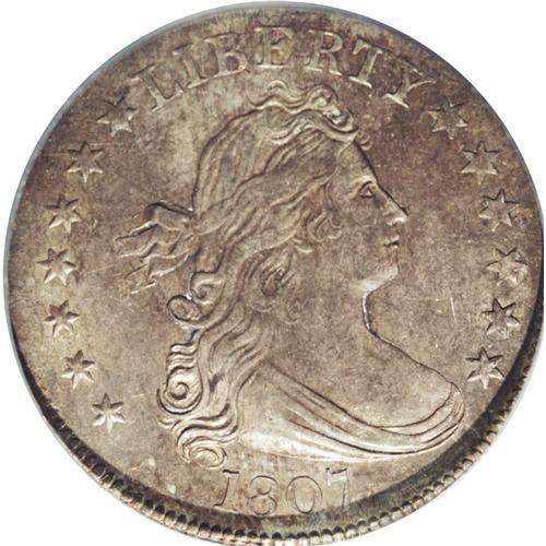<B>1807 25C AU58 PCGS.</B></I> B-1, R.3. Die State IV, as usually seen. This is the common 1807 quarter dollar variety. The reverse of this variety has just four berries, an instant attribution feature. Browning-2 quarter dollars have five berries in the branch and are slightly scarcer. It seems odd that these varieties are not given separate listings in the <I>Guide Book</B></I> as are some other similar varieties. For example, 1805 dimes are listed as 4 Berries and 5 Berries varieties. Early silver dollars include a listing for 1798 4 Berries coins. This piece is a pleasing and lustrous near-Mint example with pale gold and brownish lilac color on both sides. It is sharply struck with only a few minor blemishes.<BR><BR><b>Shipping:</b> Coin/Currency (<a target="_blank" href="http://www.heritageauctions.com/common/shipping.php">view shipping information</a>)