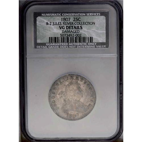 <B>1807<25C> B-2, R.3--Damaged--NCS. VG Details. Die State IV.</B></I> Broken left base of 1; 5 clear of arrowheads, merged with tail. Rough surfaces, with a few shallow punch marks on Liberty's neck and on the shield.<BR><I>Ex: First State Coins (6/1981).</B></I> Envelope Included.