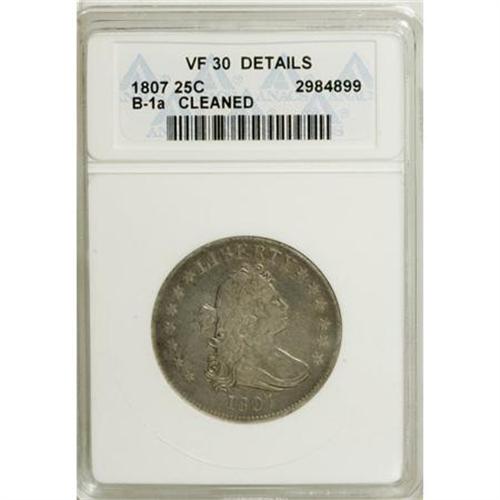 <B>1807 25C --Cleaned--ANACS. VF30 Details.</B></I> B-1a, R.3. This late die state has lapped dies with some weakened or missing details on both sides. The surfaces are pewter gray with faint hairlines and a few other insignificant abrasions.<BR><BR><b>Shipping:</b> Coins & Currency (<a target="_blank" href="http://www.heritageauctions.com/common/shipping.php">view shipping information</a>)