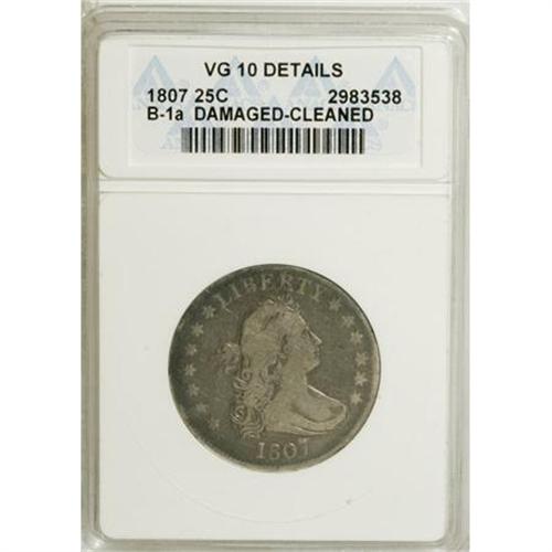 <B>1807 25C --Cleaned, Damaged--ANACS. VG10 Details.</B></I> B-1a. NGC Census: (9/111). PCGS Population (8/150). Mintage: 220,643. Numismedia Wsl. Price for NGC/PCGS coin in VG10: $283. (#5316)<BR><BR><b>Shipping:</b> Coins & Currency (<a target="_blank" href="http://www.heritageauctions.com/common/shipping.php">view shipping information</a>)