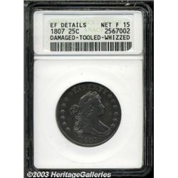 1807 25C--Damaged, Tooled, Whizzed--ANACS. XF Details, Net Fine 15. B-1, R.2. Readily distinguished from Browning-2 by the distance between the eighth star and the Y in LIBERTY. The fields have been smoothed, whizzed, and artificially toned in dark olive-brown colors. Important notice: Heritage usually auctions material at the rate of 200-250 lots per hour. On some occasions eBay Live bid software or the Internet may not be able to keep up with the pace of the auction. We recommend placing a realistic absentee bid now as insurance to avoid disappointment. Occasionally the auctioneer may eliminate or reject an eBay Live bid, and the auctioneer may also reopen a lot after the close of the eBay live bidding (usually because we missed an audience bid), and may reject your bid even if it shows you as the winning bidder. By bidding via eBay Live, you agree that Heritage may award the lot to another bidder at its sole discretion under the circumstances described above or any other reasonable circumstances. Also please note that all Heritage lots purchased through eBay Live carry a 20% Buyer's Premium. Please make sure you read the Terms and Conditions before you bid.