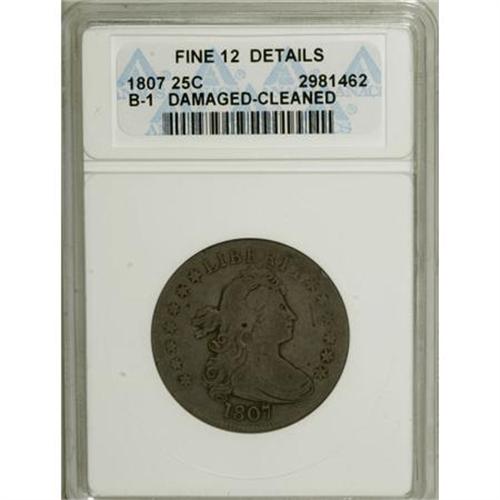 <B>1807 25C --Cleaned, Damaged--ANACS. Fine 12 Details.</B></I> B-1. NGC Census: (10/100). PCGS Population (14/136). Mintage: 220,643. Numismedia Wsl. Price for NGC/PCGS coin in F12: $392. (#5316)<BR><BR><b>Shipping:</b> Coins & Currency (<a target="_blank" href="http://www.heritageauctions.com/common/shipping.php">view shipping information</a>)