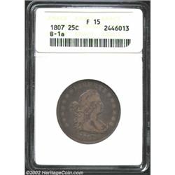 1807 25C Fine 15 ANACS. B-1a, R.4. This is a fully original example with rich, deeply set, lavender-charcoal toning. There are clashmarks (as struck) from Liberty's bust in the upper reverse field around the word OF, and the only mentionable abrasions are seen on the obverse portrait. Suitably well defined with smooth rims. Important notice: We expect to be auctioning lots at the rate of 200-250 per hour. Sometimes eBay Premier live bid software cannot keep up with that pace, so we strongly recommend that you place a realistic proxy bid now as insurance to avoid disappointment. Also please note that all Heritage/CAA lots purchased through eBay Premier carry a 20% Buyer's Premium. Please make sure you read the Terms and Conditions.