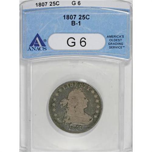 <B>1807 25C G6 ANACS.</B></I> B-1. NGC Census: (5/129). PCGS Population (13/168). Mintage: 220,643. Numismedia Wsl. Price for NGC/PCGS coin in G6 : $218. (#5316)<BR><BR><B>Coin Engraver:</B> Robert Scot<BR><BR><b>Shipping:</b> Coins & Currency (<a target="_blank" href="http://www.heritageauctions.com/common/shipping.php">view shipping information</a>)