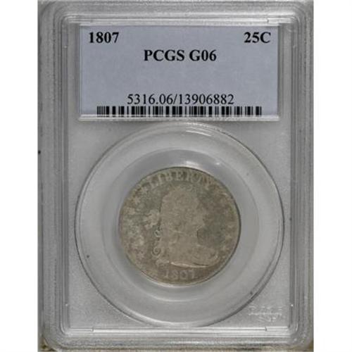 <B>1807 25C G6 PCGS.</B></I> PCGS Population (14/177). NGC Census: (5/130). Mintage: 220,643. Numismedia Wsl. Price for NGC/PCGS coin in G6 : $234. (#5316)<BR><BR><B>Coin Engraver:</B> Robert Scot<BR><BR><b>Shipping:</b> Coins & Currency (<a target="_blank" href="http://www.heritageauctions.com/common/shipping.php">view shipping information</a>)