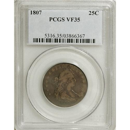 <B>1807 25C VF35 PCGS.</B></I> B-1, R.3. Cream-gray and aqua-blue patina consumes this evenly struck example. E PLURIBUS UNUM is fully legible, and marks are limited to a few tiny ticks on the right obverse. The drapery folds are prominently clashed through OF.<BR><BR><b>Shipping:</b> Coins & Currency (<a target="_blank" href="http://www.heritageauctions.com/common/shipping.php">view shipping information</a>)