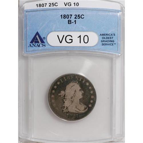 <B>1807 25C VG10 ANACS.</B></I> B-1. NGC Census: (9/111). PCGS Population (8/150). Mintage: 220,643. Numismedia Wsl. Price for NGC/PCGS coin in VG10: $283. (#5316)<BR><BR><B>Coin Engraver:</B> Robert Scot<BR><BR><b>Shipping:</b> Coins & Currency (<a target="_blank" href="http://www.heritageauctions.com/common/shipping.php">view shipping information</a>\)