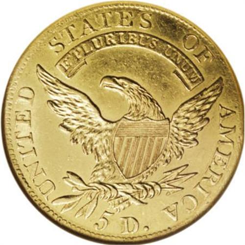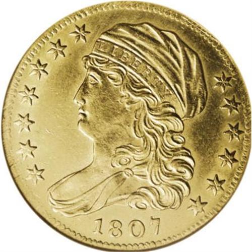 <B>1807 $5 Bust Left--Cleaned--ANACS. AU55 Details.</B></I> Breen-6453, BD-8, R.2. The 1807 Bust Left half eagle is among the most common of the type, produced from 1807 until 1812. This die marriage, BD-8, is the more common of the two varieties, with the bottom tip of the arrow feather pointing to the tip of the flag in the 5. Despite the ANACS caveat, much appeal remains on the green-gold surfaces of this lightly circulated example. The surfaces are a bit hairlined, and some undistracting adjustment marks appear near the rims on each side. <BR><BR><B>Coin Engraver:</B> John Reich<BR><BR><b>Shipping:</b> Coins & Currency (<a target="_blank" href="http://www.heritageauctions.com/common/shipping.php">view shipping information</a>)