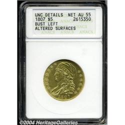 <B>1807<$5> Bust Left--Altered Surfaces--ANACS. Unc Details, Net AU55.</B></I> B. 5-D, Miller-101, R.3. The John Reich designed 1807 Capped Draped Bust design is popular as the first year of the type, plus it is also one of the more frequently encountered coins in the series. Unusually well detailed for the type, each side presents an abnormally bright appearance from a noticeable cleaning. Some die clashing is seen on the obverse, while some counterclockwise die alignment is also noted.<BR><I>From The Paulsboro Collection, Part Two.</B></I> <BR><BR><B>Important notice:</B> Heritage usually auctions material at the rate of 200-250 lots per hour. On some occasions eBay Live bid software or the Internet may not be able to keep up with the pace of the auction. We recommend placing a realistic absentee bid now as insurance to avoid disappointment. Occasionally the auctioneer may eliminate or reject an eBay Live bid, and the auctioneer may also reopen a lot after the close of the eBay live bidding (usually because we missed an audience bid), and may reject your bid even if it shows you as the winning bidder. By bidding via eBay Live, you agree that Heritage may award the lot to another bidder at its sole discretion under the circumstances described above or any other reasonable circumstances. Since eBay bids are not shown to us until we open the lot on the floor, we treat those bids just like floor bids. In most cases the floor responds before the eBay bid is presented to us, due to Internet lag time, so for consistency we have made it a policy that floor bids are always considered first over tie eBay live bids. Also please note that all Heritage lots purchased through eBay Live carry a 20% Buyer's Premium. Please make sure you read the Terms and Conditions before you bid. </span></font></tr></table></td></tr></table>
