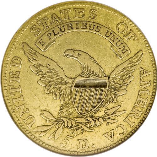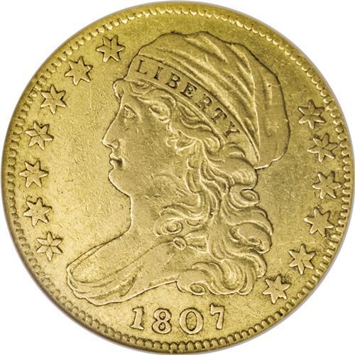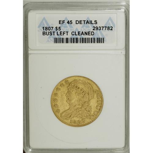 <B>1807 $5 Bust Left--Cleaned--ANACS. XF45 Details.</B></I> Breen-6453, BD-8, R.2. This is the first year of the Capped Bust design on the half eagle. The die pairing is distinguished by the lone 1807 Capped Bust left obverse combined with a reverse that displays the tip of the feather pointing to the tip of the flag of the 5 in the denomination. Yellow-gold surfaces display hints of light green, and traces of luster in the protected areas. A few faint hairlines are noted over each side. The design features are well defined, save for weakness in most of the star centers, and the dentilation is fairly strong on both obverse and reverse. The light cleaning detracts only slightly from the coin's eye appeal.<BR><BR><b>Shipping:</b> Coins & Currency (<a target="_blank" href="http://www.heritageauctions.com/common/shipping.php">view shipping information</a>)