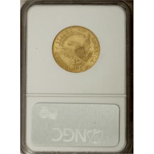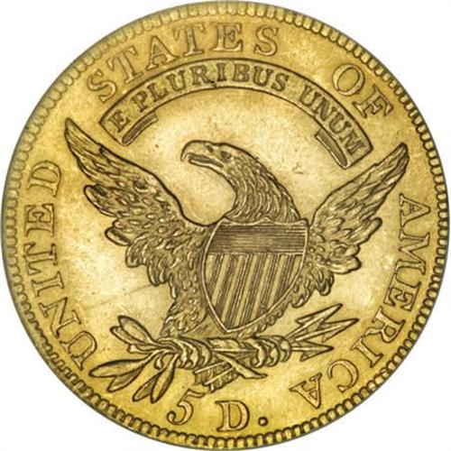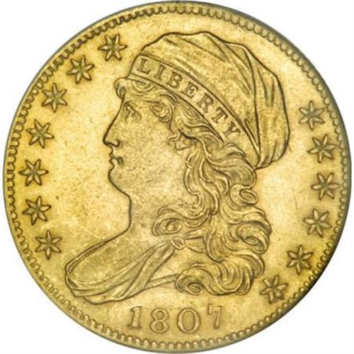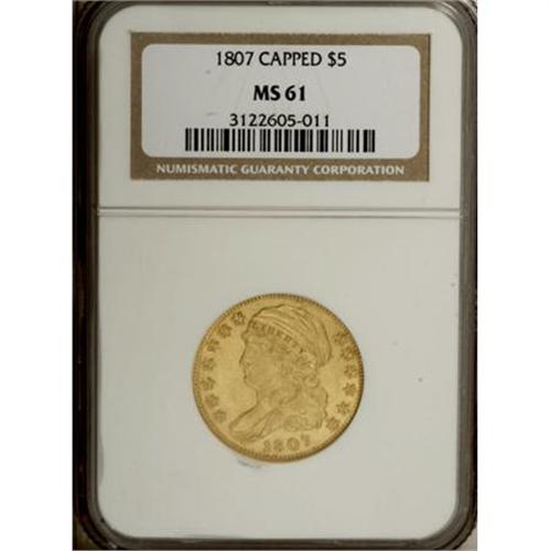 <B>1807 $5 Bust Left MS61 NGC.</B></I> Breen-6453, BD-8, R.2. The lowest feather tip on the fletchings points to the tip of the flag on the 5 in the denomination, a key to this R.2 variety, since the High R.5 BD-7 variety that shares the same obverse shows the feather tip pointing toward the center of the flag. Harry W. Bass, Jr., owned four coins of this variety, according to the Bass-Dannreuther reference <I>Early U.S. Gold Coin Varieties. </B></I><BR> This example shows lustrous greenish-yellow surfaces that show a few light contact marks. The only singular distraction is a hair-thin scrape from near the N in UNITED to the underside of the eagle's wing. Considerable reflectivity is evident, a bit more so on the reverse. A pleasing example of this early type coin in an affordable grade.<BR><I>Ex: The Marvin P. Matlock, M.D. Collection (Bowers and Merena, 3/1991), lot 1745.<BR>From The John Stimson, Sr. Collection, Part One.</B></I><BR><BR><B>Coin Engraver:</B> John Reich<BR><BR><b>Shipping:</b> Coins & Currency (<a target="_blank" href="http://www.heritageauctions.com/common/shipping.php">view shipping information</a>)