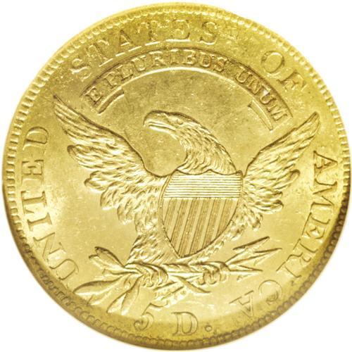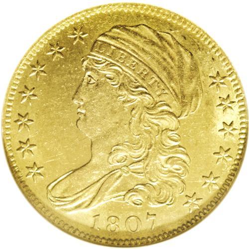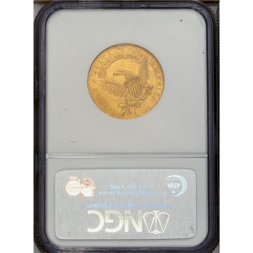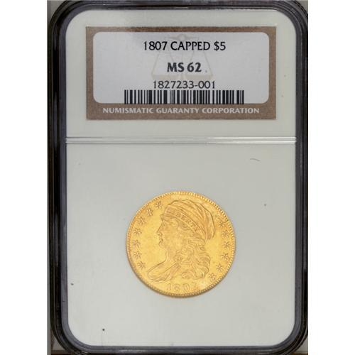 <B>1807<$5> Bust Left MS62 NGC.</B></I> B. 5-D, Breen-6453, Bass-3019, Miller-101, R.3. John Reich created his Capped Bust design for the half eagles shortly after his employment at the Mint began in April 1807. It was in this year that Mint Director Robert Patterson became concerned about the engraving department. He wrote to the President concerning Robert Scot: "though indeed a meritorious and faithful officer, was yet so far advanced in life that he could not very long be expected to continue his labors." Patterson wrote further that John Reich was already serving at the Mint: "Mr. Reich is now preparing a set of new dies, in which some improvements in the devices will be introduced, which, it is hoped, will meet with public approbation." Although we can't be certain today, Mr. Scot was probably none too thrilled with this new circumstance, for he continued serving the Mint for another 17 years until his death in 1824, while Reich left after only 10 years of service.<BR> This is a pleasing Mint State example of Reich's new design, and it has lovely green-gold color with frosty surfaces. Each side has lightly abraded and faintly hairlines surfaces that are consistent with the grade. It is a sharply struck and highly appealing example.<BR><I>From The Antigo Collection.</B></I>