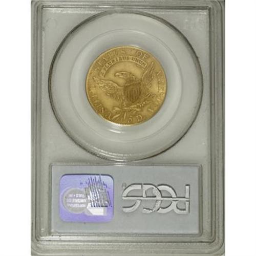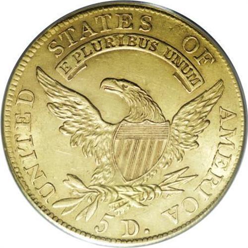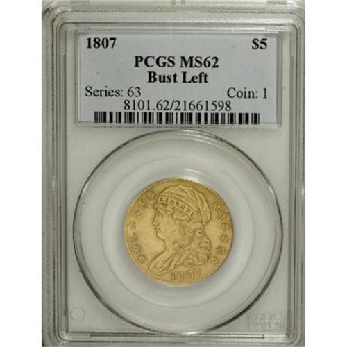 <B>1807 $5 Bust Left MS62 PCGS.</B></I> Breen-6453, BD-8, R.2. Medium yellow with full luster on both sides. The surfaces have a few faint hairlines and insignificant blemishes, but the overall appearance is above average. This is the common 1807 Capped Bust variety, among the most common die varieties of any early gold issue. It is also the first year of issue for the new design, and the first year of employment for John Reich, who was hired as assistant engraver at the Mint on April 1, 1807.<BR> Contemporary sources tell us that John Reich came to America circa 1800, an immigrant from Germany. After occasional contract work, he was hired full time in 1807 and began a complete overhaul of coinage designs. The half dollar and half eagle were first, with new designs introduced later in 1807.<BR> <BR><BR><B>Coin Engraver:</B> John Reich<BR><BR><b>Shipping:</b> Coins & Currency (<a target="_blank" href="http://www.heritageauctions.com/common/shipping.php">view shipping information</a>)