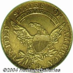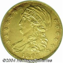 <B>1807<$5> Bust Left Unc Details, Burnished, NCS.</B></I> B. 5-D, Miller-101, R.3. A bright and sharply struck representative that has noticeable black spotting (resembling die rust) around the reverse periphery. Both sides are hairlined, but there are no other abrasions of note. Struck from slightly rotated dies. <BR><BR><B>Important notice:</B> Heritage usually auctions material at the rate of 200-250 lots per hour. On some occasions eBay Live bid software or the Internet may not be able to keep up with the pace of the auction. We recommend placing a realistic absentee bid now as insurance to avoid disappointment. Occasionally the auctioneer may eliminate or reject an eBay Live bid, and the auctioneer may also reopen a lot after the close of the eBay live bidding (usually because we missed an audience bid), and may reject your bid even if it shows you as the winning bidder. By bidding via eBay Live, you agree that Heritage may award the lot to another bidder at its sole discretion under the circumstances described above or any other reasonable circumstances. Since eBay bids are not shown to us until we open the lot on the floor, we treat those bids just like floor bids. In most cases the floor responds before the eBay bid is presented to us, due to Internet lag time, so for consistency we have made it a policy that floor bids are always considered first over tie eBay live bids. Also please note that all Heritage lots purchased through eBay Live carry a 20% Buyer's Premium. Please make sure you read the Terms and Conditions before you bid. </span></font></tr></table></td></tr></table>