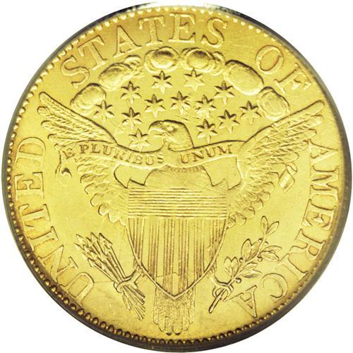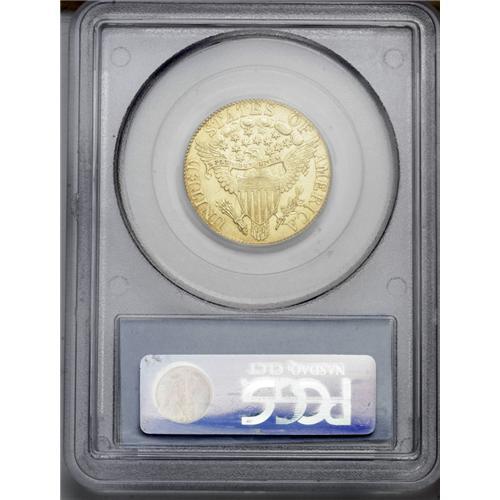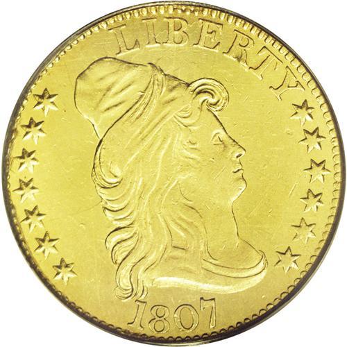 <B>1807<$5> Bust Right AU55 PCGS.</B></I> Small Date, Small Obverse Stars, Large Reverse Stars, Breen-6450, B. 2-B, Miller-87, R.7. To the best of our knowledge, this very rare die marriage has appeared only once before in a Heritage Signature auction, as lot 9137 in our July 2002 New York auction. Although few currently collect 1807 half eagles by variety, this could change in the future as the relative rarity of the die pairings are better appreciated. This nicely struck straw-gold piece has light mint-made adjustment marks on the shield, and both sides display dramatic clash marks, but there are no mentionable abrasions.