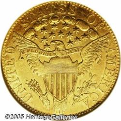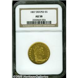 <B>1807 $5 Bust Right AU58 NGC.</B></I> B. 1-B, Miller-86, R.5. Only one of the six known die marriages of the 1807 Bust Right Half Eagle is seen with any degree of regularity, and B. 1-B is not it. Also of note is the difficulty in locating a sharply struck representative of this final-year issue that most collectors experience. The obverse of the present example is uncommonly well impressed with considerable sharpness to Liberty's portrait and not all that distracting softness of detail on the star centrils. The reverse is less well defined, particularly in the center, but the major design elements are appreciably bold. Green-gold and orange-gold colors are well blended over both sides, a pair of small digs in the right obverse field being the only singularly mentionable abrasions.