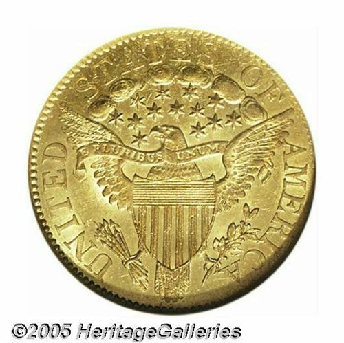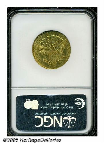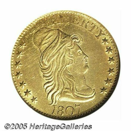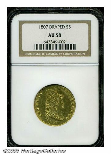 <B>1807<$5> Bust Right AU58 NGC.</B></I> Large Date, Breen-6452, B. 4-C, Miller-90, High R.5. The only Bust Right, Large Date dies. For this rare variety, the 1 and 0 in the date are recut over smaller 1 and 0 counterparts. Very close to Mint State, this pleasing Bust Left piece exhibits extensive radiant luster, and all breast feathers are accounted for. A couple of inconspicuous pinscratches concealed within the curls and pair of handling marks in the upper right obverse field do not significantly affect the eye appeal.