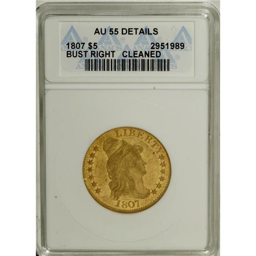 <B>1807 $5 Bust Right--Cleaned--ANACS. AU55 Details.</B></I> Small Date, Small Obverse Stars, Small Reverse Stars, Breen-6449, BD-1, High R.4. A well struck piece with slight friction on the cloud centers and on Liberty's forehead. Moderately hairlined, but considerable luster brightens the peripheries and devices. A worthy addition to an early gold variety holding.<BR><I>From The Stecher Collection, Part Two.</B></I><BR><BR><b>Shipping:</b> Coins & Currency (<a target="_blank" href="http://www.heritageauctions.com/common/shipping.php">view shipping information</a>)