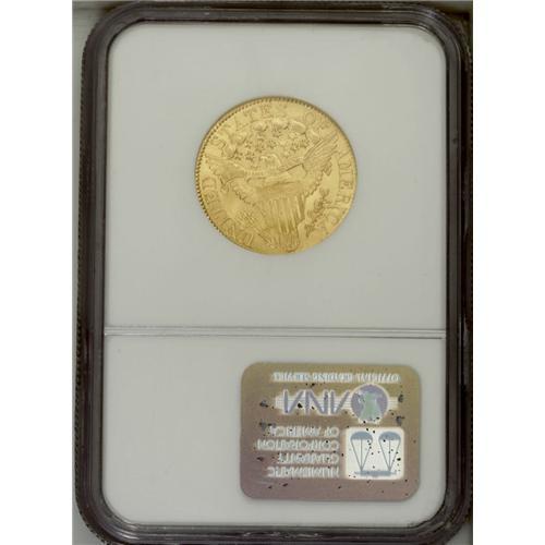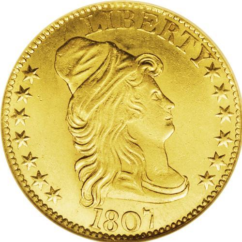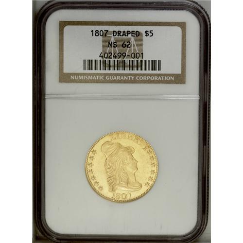 <B>1807 $5 Bust Right MS62 NGC.</B></I> Large Date, Breen-6452, BD-6, High R.4. This attractive and unblemished piece is smooth save for a couple of light mint-made roller marks on the portrait. Luster is comprehensive across the reverse, and dominates the obverse devices. There are two important die states for BD-6. Early dies examples, such as the present piece, have a bold cloud 3. Eventually, the reverse die is lapped, greatly weakening cloud 3. Gold specialist Harry W. Bass, Jr. was probably the first numismatist to recognize these two die states. A survey of recent appearances of BD-6 in Heritage auctions suggests that these two states are roughly equal in rarity.<BR><BR><b>Shipping:</b> Coin/Currency (<a target="_blank" href="http://www.heritageauctions.com/common/shipping.php">view shipping information</a>)