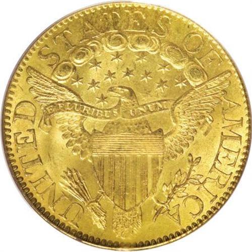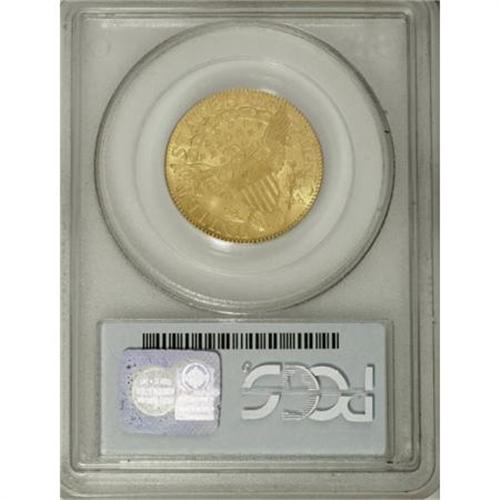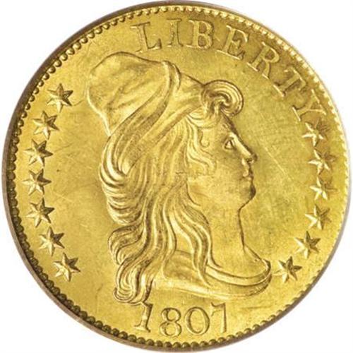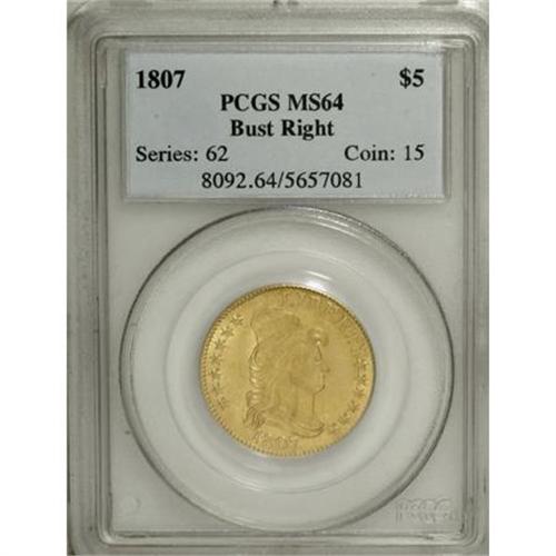 <B>1807 $5 Bust Right MS64 PCGS.</B></I> Small Date, Small Obverse Stars, Small Reverse Stars, Breen-6449, BD-1, High R.4. Bass-Dannreuther Obverse Die State B, Reverse Die State C, struck prior to the development of a "cud" above the T in UNITED. BD-1 receives a separate listing in Breen's 1988 <I>Encyclopedia,</B></I> since it is the only die pairing for the date with small reverse stars. An apparently unfinished die, the right olive branch is without stems on the berries, and a pair of leaves are outlined but without details. There are prominent raised die lines (as struck) on the right olive branch and the upper left shield tip. A lustrous and pleasing near-Gem. The obverse has a few faint hairlines, while the reverse is virtually pristine. Sharply struck except for the lowest right reverse star. The dies are rotated counterclockwise.<BR>The usual 1807 half eagle is the BD-8 Bust Left variety, which is in fact among the most common die marriages of all early (old tenor) five dollar pieces, along with the 1810 BD-4. Although six different die varieties are known, the 1807 Bust Right is actually significantly scarcer than the BD-8. At the MS64 level, the 1807 Bust Right is approximately four times scarcer than its Bust Left counterpart. The present lot once belonged to Harry W. Bass, Jr., the most prominent die variety collector of early gold, and the fact that he selected it for his collection speaks highly of its quality.<BR><I>Ex: A-Mark Coin, 3/78, Harry W. Bass, Jr. Collection (Bowers & Merena, 10/99), lot 779; Salt Lake City ANA Money Show (Superior, 3/01), lot 804; The Frank Manthey Collection of Gold Coins (Heritage, 12/05), lot 1301.</B></I><BR><I>From The Julian Collection.</B></I><BR><BR><B>Coin Engraver:</B> Robert Scot<BR><BR><b>Shipping:</b> Coins & Currency (<a target="_blank" href="http://www.heritageauctions.com/common/shipping.php">view shipping information</a>\)
