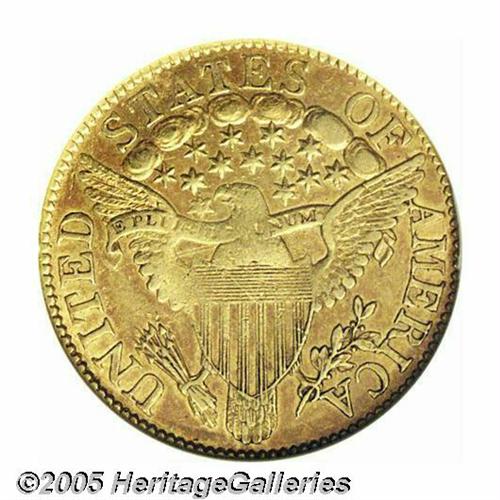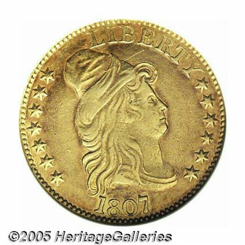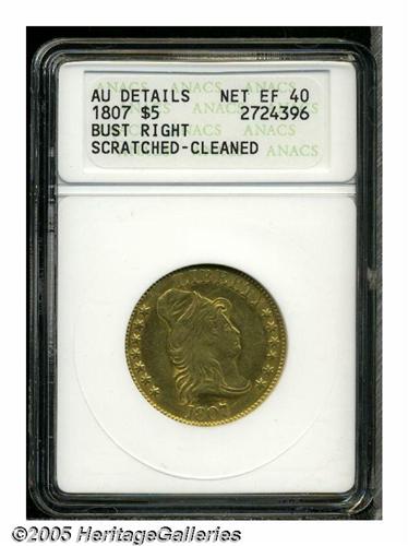 <B>1807<$5> Bust Right--Scratched, Cleaned--ANACS. AU Details, Net XF40.</B></I> Small Date, Small Obverse Stars, Large Reverse Stars, Breen-6450, B. 2-C, Miller-88, High R.5. A buffed example of this rare final year Bust Right issue, which is far more difficult to secure than its 1807 Bust Left alternative. Retoned in rich golden-brown hues, luster glistens from the margins and devices. Bluntly struck in the centers with some handling marks on the eagle's breast and a concealed pinscratch through the cap.<BR><I>From the Dr. Kurt Peters Collection.</B></I> From the Dr. Kurt Peters Collection.