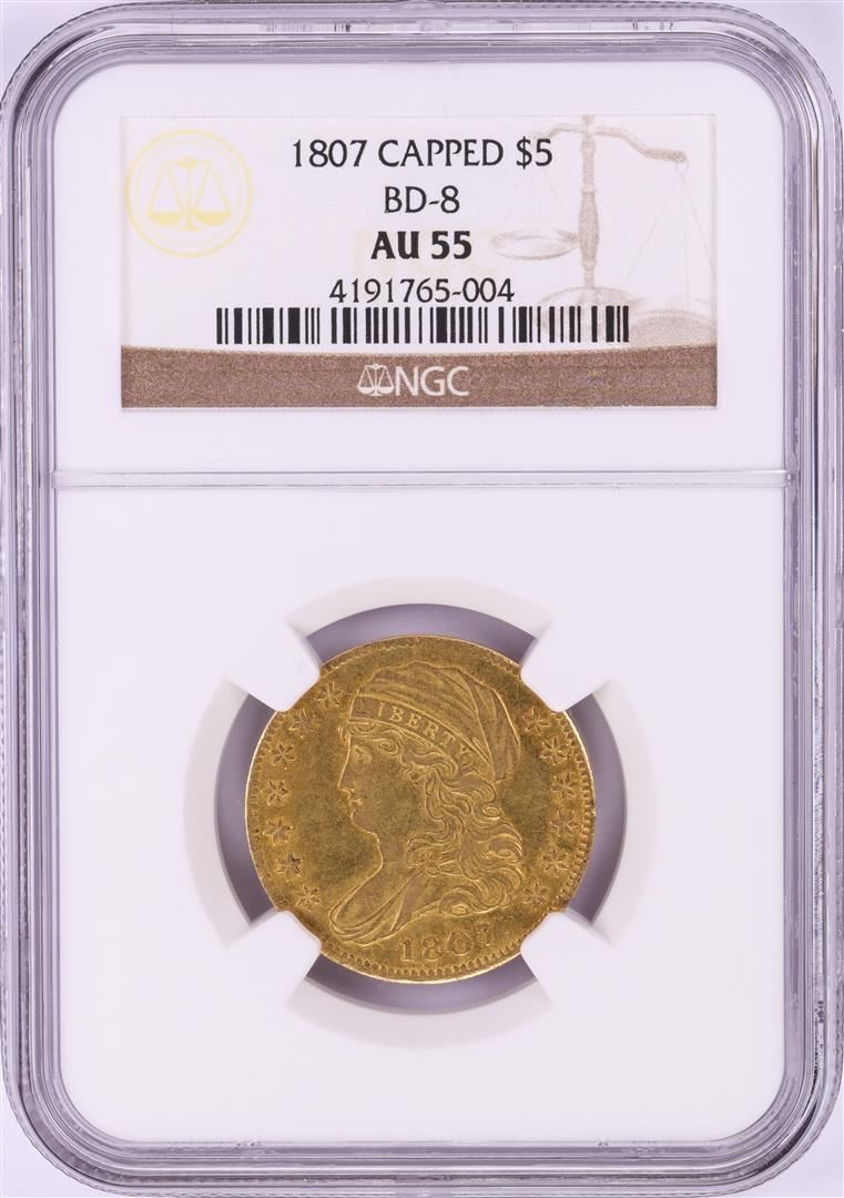 One 1807 $5 Capped Bust Half Eagle Gold Coin NGC AU55 BD-8. NGC Certified.