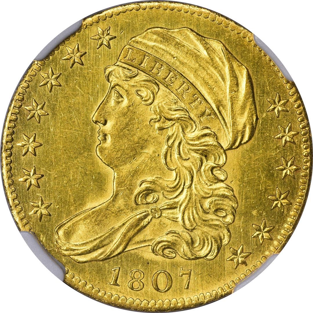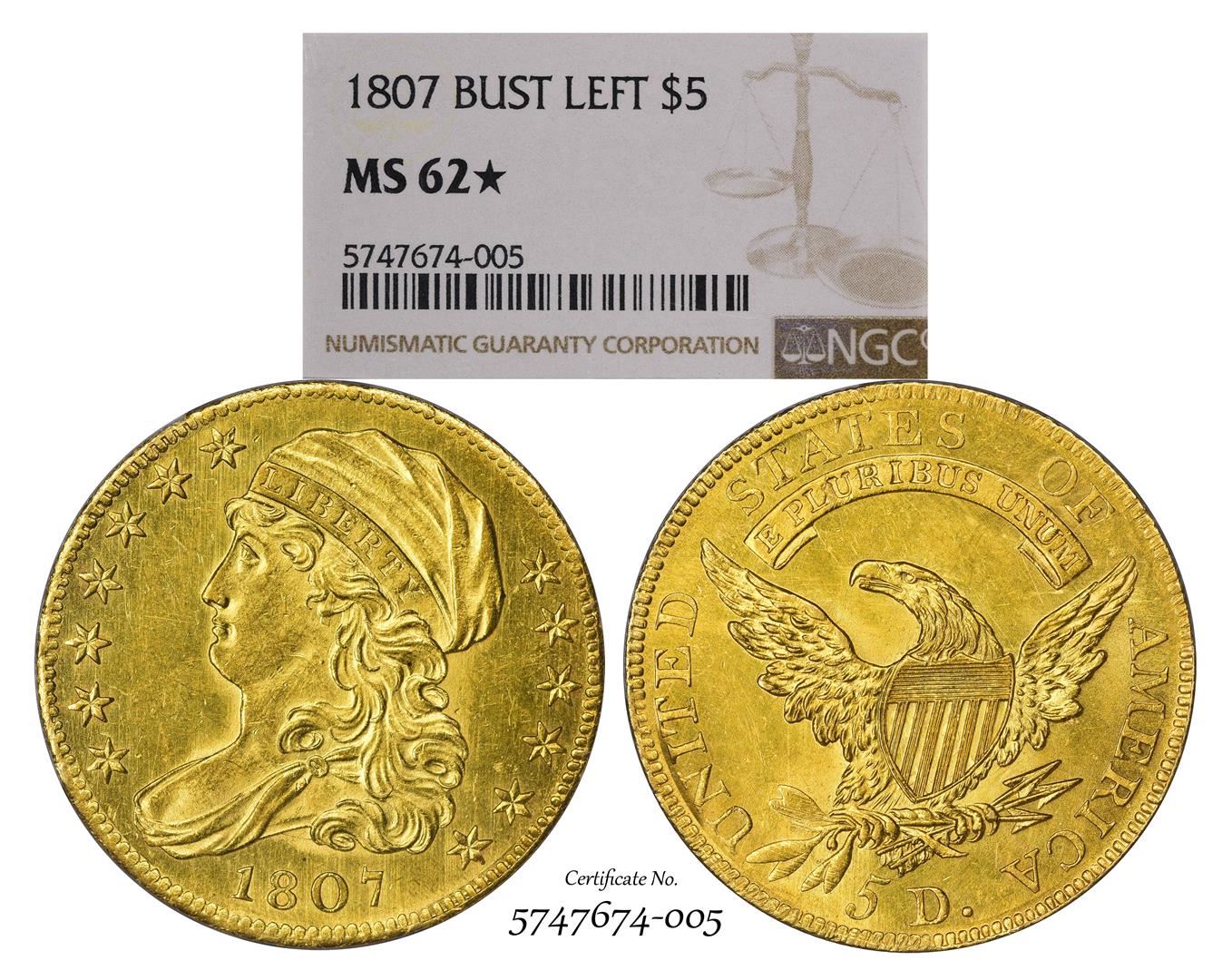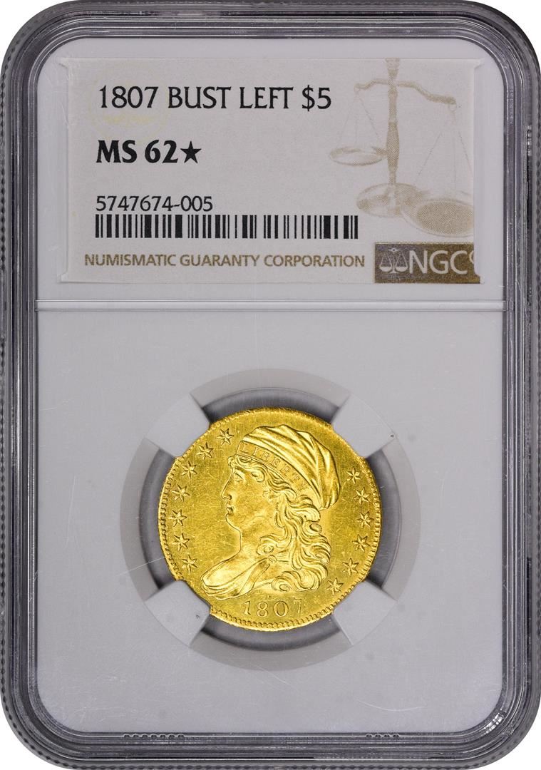 One 1807 $5 Capped Bust Left Half Eagle Gold Coin NGC MS62* Star. NGC Certified.