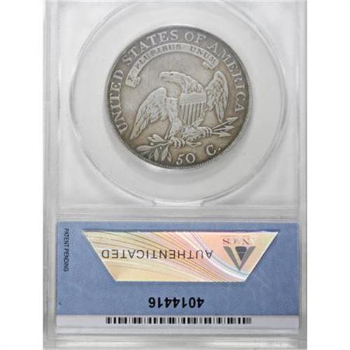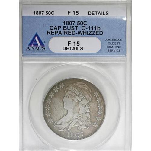 <B>1807 50C Bearded Goddess--Repaired, Whizzed--ANACS. Fine 15 Details.</B></I> O-111b, R.5. One of only a handful of die crack varieties listed in the Guide Book, along with the 1861-O "Confederate Crack" half dollar. Liberty's "beard" is clear, and much plumage detail remains. Granular and a bit bright from whizzing, and a field repair is noted near the NI in UNITED. A scratch from star 5 to the drapery clasp is subdued by subtle tooling.<BR><BR><B>Coin Engraver:</B> John Reich<BR><BR><b>Shipping:</b> Coins & Currency (<a target="_blank" href="http://www.heritageauctions.com/common/shipping.php">view shipping information</a>)