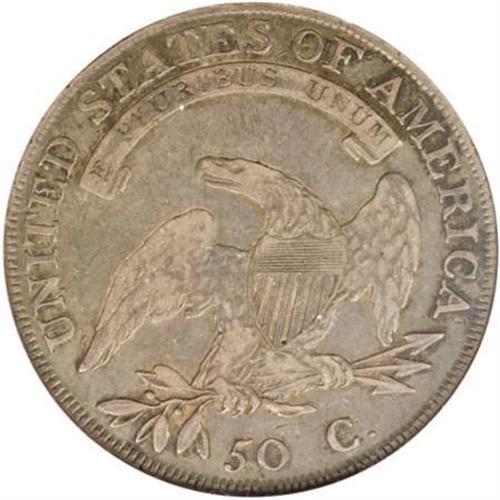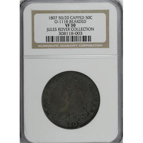 <B>1807 50C Bearded Goddess VF30 NGC.</B></I> Large Stars, 50 Over 20.<B> </B></I>O-111b, R.5. One of the few die crack varieties listed in the Guide Book, and a die pairing long coveted by Capped Bust specialists. This representative possesses deep tan-brown toning, and is smooth aside from a couple of subdued thin marks on Liberty's neck.<BR><I>Ex: Jules Reiver Collection (Heritage, 1/06), lot 22595.</B></I><BR><BR><B>Coin Engraver:</B> John Reich<BR><BR><b>Shipping:</b> Coins & Currency (<a target="_blank" href="http://www.heritageauctions.com/common/shipping.php">view shipping information</a>)