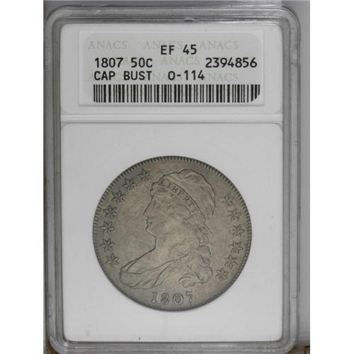 <B>1807 50C Capped Bust, Large Stars XF45 ANACS.</B></I> O-114, R.3. A deep brown half dollar without unpleasant marks. Some striking softness on the neck curls, but the stars and wings are sharp. Struck from clashed dies.<BR><I>From The Diamond Collection, Part Two.</B></I>