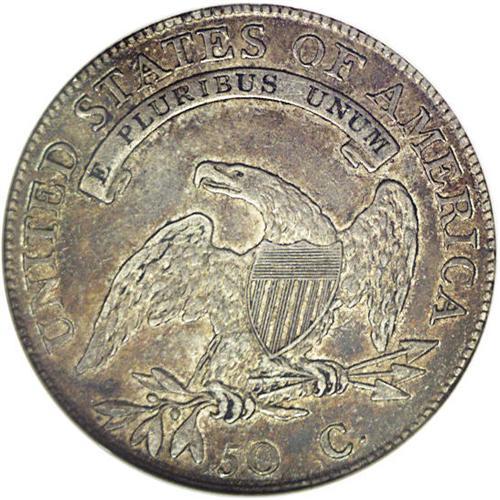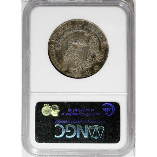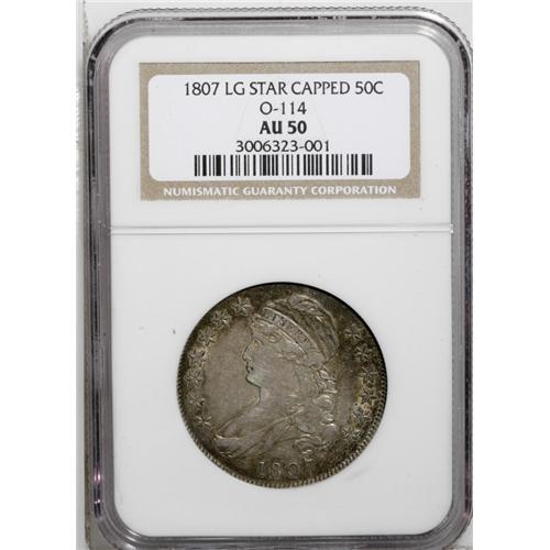 <B>1807<50C> Capped Bust, Large Stars AU50 NGC.</B></I> O-114, R.3. Substantial pewter-gray color on the obverse is accented by deeper peripheral gold with similar color across most of the reverse. Some luster remains visible but it is subdued by the toning. This is a popular and important <I>Guide Book</B></I> variety.