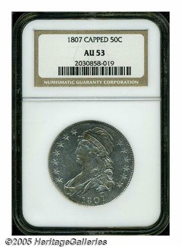 <B>1807<50C> Capped Bust, Large Stars AU53 NGC.</B></I> O-114, R.3. The devices exhibit blushes of honey color, but this bright example is otherwise brilliant. Luster dominates the stars, legends, hair, plumage, and shield. Mint-made clash marks are prominent, but no abrasions are relevant.