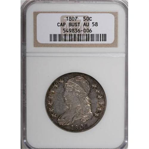<B>1807 50C Capped Bust, Large Stars AU58 NGC.</B></I> O-114, R.3. This die marriage is the only 1807 Large Stars Capped Bust variety that is <I>not</B></I> paired with the familiar 50 over 20 blundered reverse. As such, O-114 receives a separate listing in the <I>Guide Book. </B></I>Golden-brown freckles invigorate the margins of this partly lustrous and lightly abraded near-Mint example.<BR><BR><B>Coin Engraver:</B> John Reich<BR><BR><b>Shipping:</b> Coins & Currency (<a target="_blank" href="http://www.heritageauctions.com/common/shipping.php">view shipping information</a>)