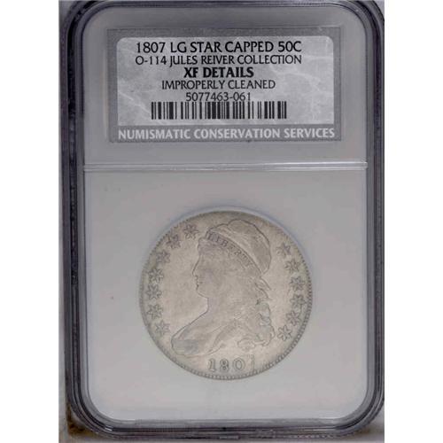 <B>1807<50C> Capped Bust, Large Stars XF40--Improperly Cleaned--NCS. XF Details.</B></I> O-114, R.3. Easily attributed by die lumps below the 7 and to the right of star 11. On the reverse, the two lower arrowheads are joined, and there is a center dot on the eagle's left (facing) wing at the shoulder. After conservation this piece is attractive, with an even dove-gray color and minimal mentionable distractions.<BR><I>Ex: Don Frederick (5/20/1980).</B></I> Envelope Included.