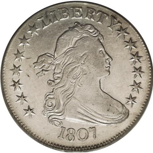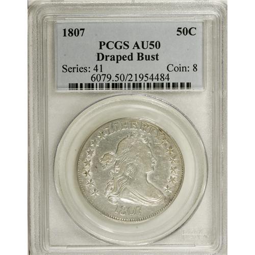 <B>1807 50C Draped Bust AU50 PCGS.</B></I> O-102, R.2. This piece is typical of many (or most) 1807 Draped Bust half dollars with blunt hair details at the upper obverse. Both sides are almost entirely lustrous with only slight wear visible on the high points of the design. A few faint hairlines are evident on the brilliant silver surfaces.<BR><BR><b>Shipping:</b> Coins & Currency (<a target="_blank" href="http://www.heritageauctions.com/common/shipping.php">view shipping information</a>)