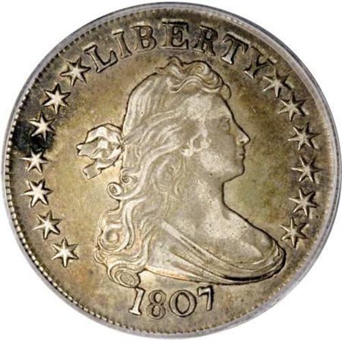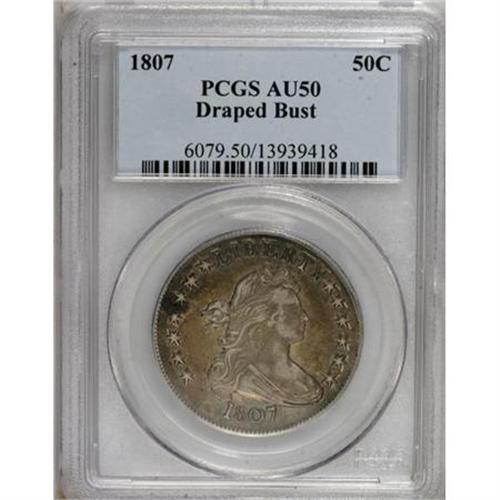<B>1807 50C Draped Bust AU50 PCGS.</B></I> O-108, R.3. Rich autumn-brown and olive toning deepens toward the rims. The devices are dove-gray. There are no relevant marks, and moderate wear is noted on the eagle's neck and Liberty's jaw, forehead, and shoulder. A problem-free example of this scarce early silver type.<BR><BR><B>Coin Engraver:</B> Robert Scot<BR><BR><b>Shipping:</b> Coins & Currency (<a target="_blank" href="http://www.heritageauctions.com/common/shipping.php">view shipping information</a>)